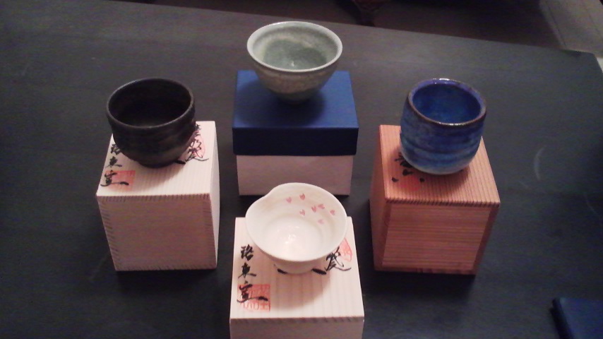 さてさて、写真は京都旅行の時に買った酒器3点と骨董市で買った品1点。