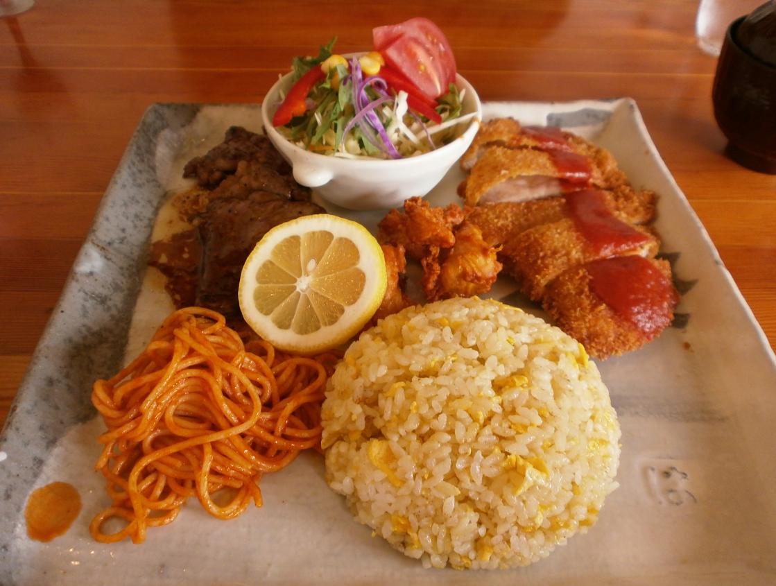 内容物「ステーキ、からあげ、トンカツ、パスタ、ガーリックライス」